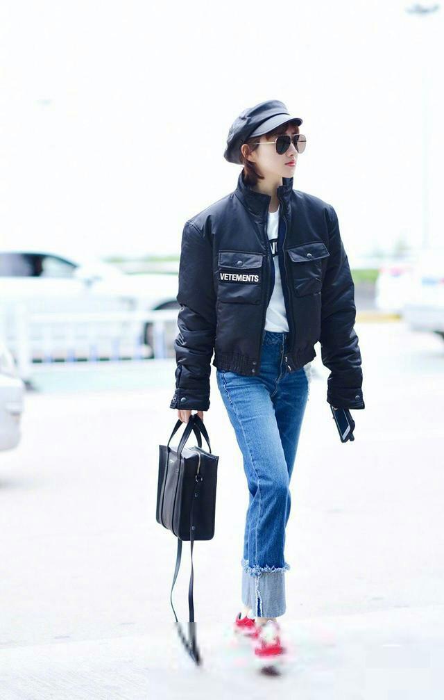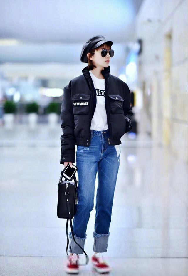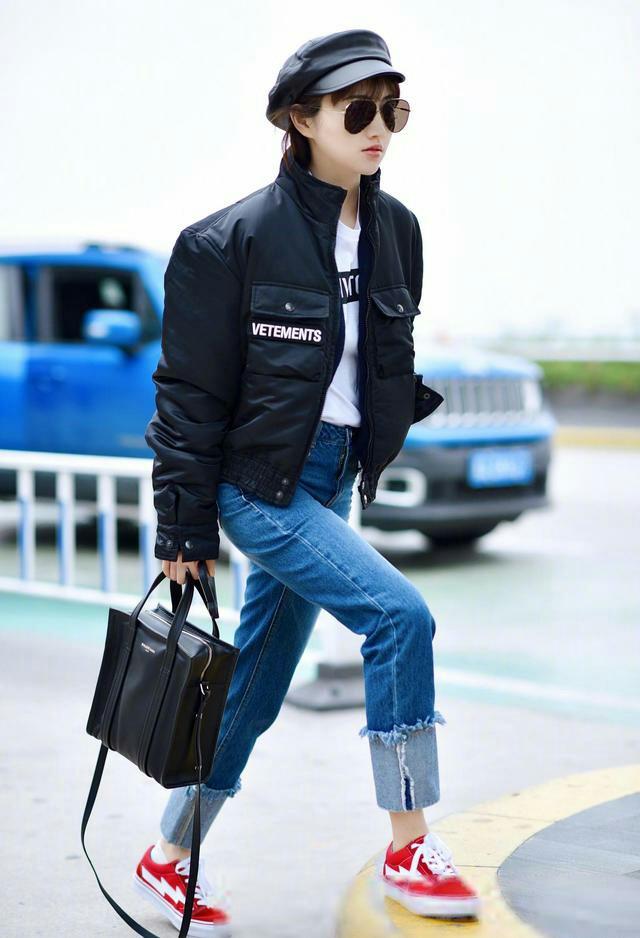一条牛仔裤加上小运动板鞋,黑色外套的小棉袄,加上黑色的小香包,就显得真个人非常的干净利