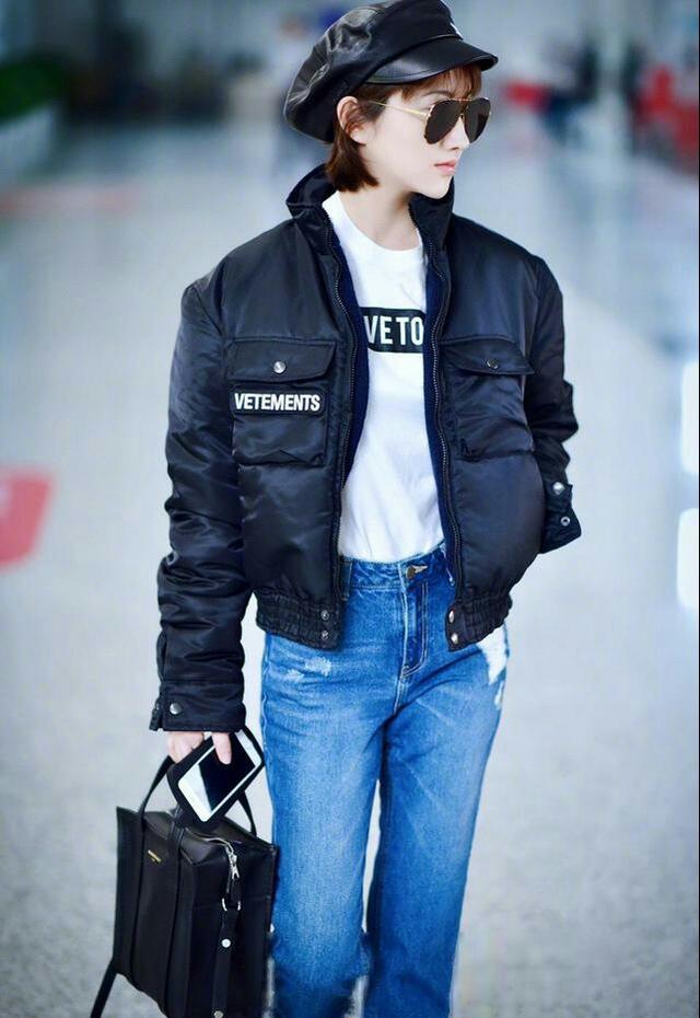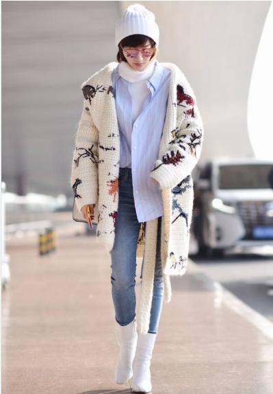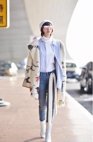 我们来看看怎么搭配才不会显得自己变成了企鹅,毛线针织外套也可以搭配牛仔裤,景甜的这一身搭配还真的不错,重点的颜色的搭配非常的好,3个单色就解决了衣服一身的衣服搭配,包括鞋子也一样,牛仔裤可以修饰出你的大长腿。
