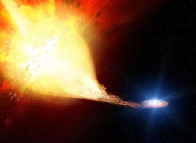 一种Ia型超新星的爆炸机制:白矮星从伴星那里吸积气体物质,当其达到临界质量时,就会发生猛烈的核爆炸,产生超新星爆发。