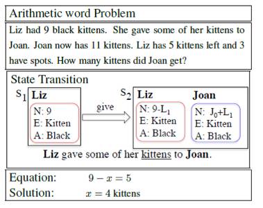 2014的工作,把数学题通过自然语言处理得到几个变量状态之后,需要推理得到各个变量状态之间的关系得出数学公式。在他给出的例子中,计算机通过学习能得到动词“give”代表两个状态相减。