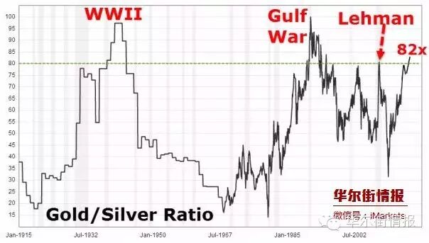 在现代历史中,黄金/白银达到如此高的水平仅出现过3次,都是世界极度混乱的时期:2008年金融危机,海湾战争和第二次世界大战。