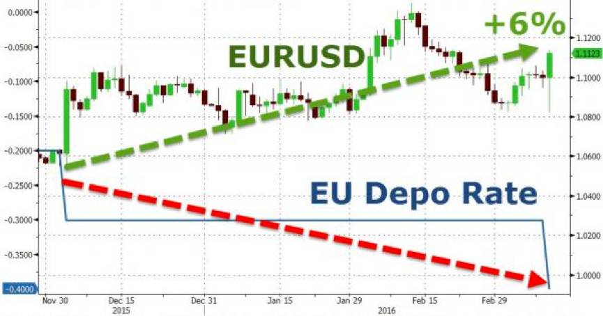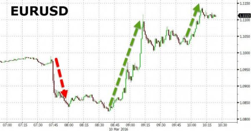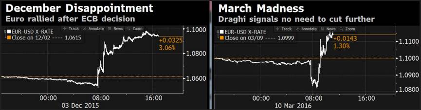 这种大逆转的戏码比欧央行12月的那次会议更让人意外。当时德拉吉宣布降息并扩大QE计划,但因程度不及预期,被投资者“嫌弃”,欧元大涨。