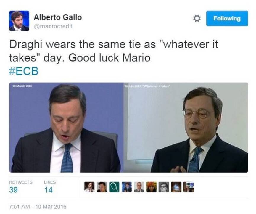 细心的分析师发现,德拉吉在昨晚的新闻发布会上系了一条和当年承诺“竭尽所能”拯救欧元当天一样的领带。