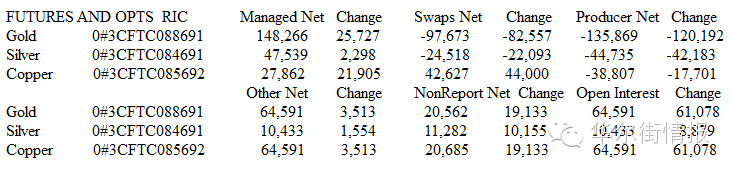 具体数据显示,截至3月8日当周,COMEX黄金投机净多头头寸增加25727手,至148266手;COMEX白银投机净多头头寸增加2297手,至47539手;COMEX铜投机净多头头寸增加21905手,至27862手。因上周公布的美国非农就业显示美国就业人数激增,但薪资下滑,美联储近期加息威胁受到削弱,铜价飙升至4个月高位。之前一周铜净头寸首次转而净多。