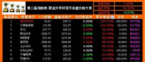 当时赛况在淘股吧直播,交割单、操盘实录在贴吧内公开,与众友分享,引得高朋满座,一时间竟广传真经,淘股吧百万实盘赛也由此闻名于世。
