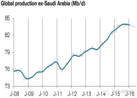 瑞信分析师Ed Westlake和Jan Stuart 周三通过一张图向市场显示,全球原油产量(不包括沙特)在2016年已经放缓至8300万桶/天,而这一数字在2015年中期为8400万桶/天。