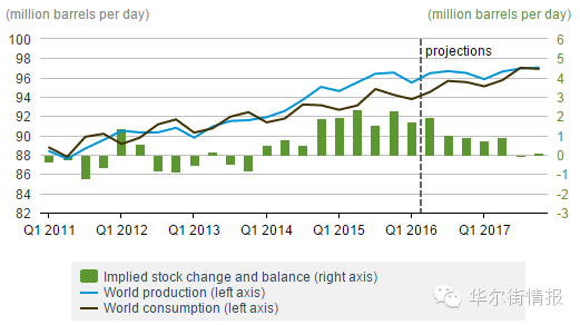 但是美国能源信息署最新的数据显示,全球原油产量总量从2015年的9576万桶/天上涨至2016年的9627万桶/天。