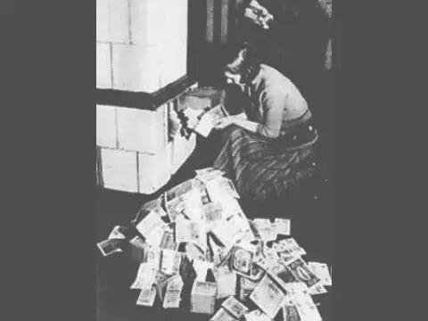 B,在第一次世界大战后,德国背负了巨大的战争债务。为了快速偿还战争债务并避免对德国人持有的金马克直接征税,德国政府开始发行一种全新的没有任何支撑的货币。从1914年至1924年,一盎司黄金兑1马克的汇率暴涨至1盎司黄金兑超过1万亿马克,这代表了德国政府所发行的新钞数量。到20世纪90年代中期,德国马克的价值仅仅为引火物,而不是货币。