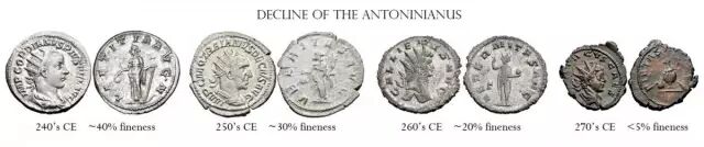 A,罗马帝国衰落的一个主要原因就是过度的军事扩张。在罗马帝国三世纪后期阶段,罗马的统治者试图通过铸造更多的钱币来支付战争的支出。罗马人将铸造钱币的金银换成铜,这样以前铸造一枚钱币现在可以铸造5枚到10枚钱币。到帝国覆灭时,大部分罗马人的金银已经耗尽。