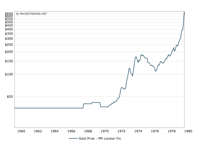 C,美国政府因为越战积累了巨额债务,当时的美国总统尼克松不得不宣布美元与黄金脱钩,自1933年以来开始实施的1盎司黄金兑换35美元固定汇率不复存在。1971年金本位崩溃之后,黄金价格在9年中上涨了2400%,至850美元/盎司,这反映了美元的贬值。