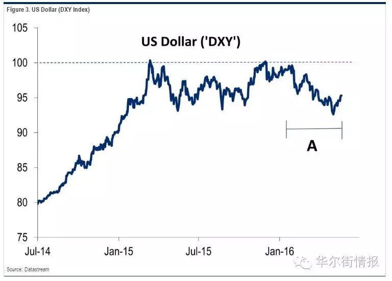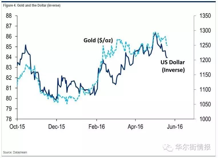 该分析师团队指出,投资者们近来已经对将美元指数推高至100以上的水平”表现出明显的厌恶,第一次这种情绪的外露发生于2015年3月,第二次则发生于2016年1月。今年1月至4月美元指数的回落是金价已经成功获得动力的关键原因。