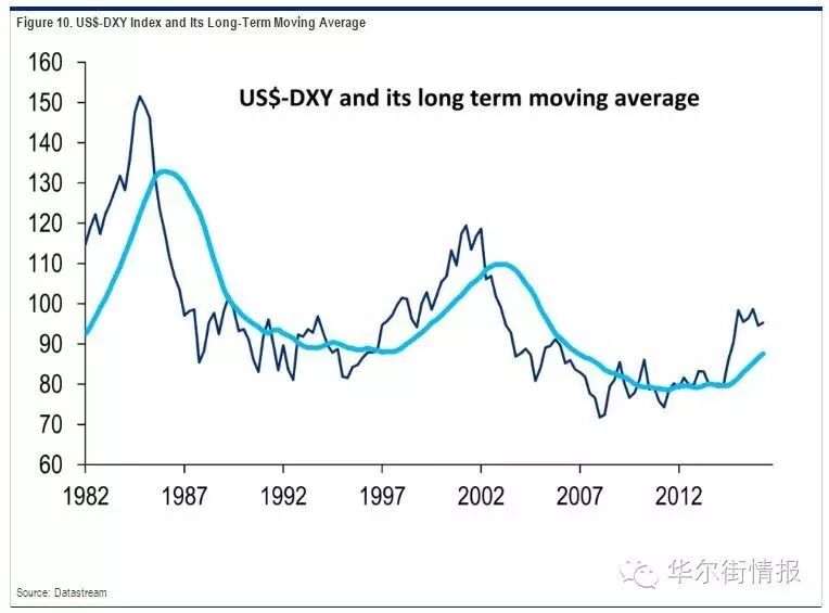 花旗集团提供的以下这张表格展现了美元指数有着长期动力。另一个显示美元指数有可能突破100水平的迹象是其移动平均线的大幅上涨。