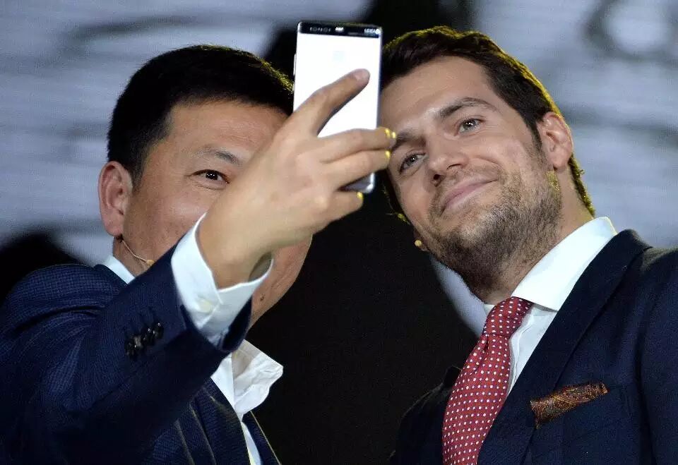 ▲华为技术有限公司高级副总裁余承东(左)和影星、“新超人”亨利·卡维尔在英国伦敦举行的新品发布会上展示新款华为手机。(美国《福布斯》杂志网站)