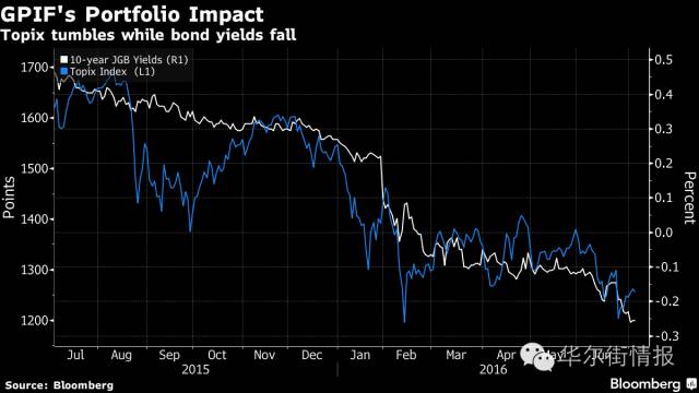 图:日本政府养老投资基金的投资组合影响,债券收益(白线)下跌时东证指数(蓝线)也下跌了
