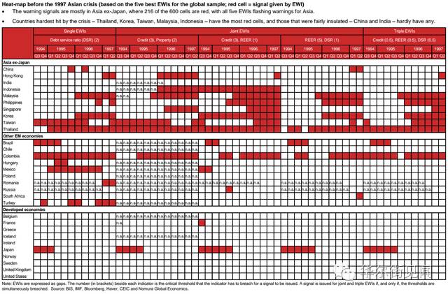 野村通过综合对比信贷/GDP比、债务比、实际有效汇率、实际楼市和股市等资产价格后发现,亚洲是目前全球风险最高的区域。其高危程度为1997年亚洲金融后之最,新的金融危机可能随时出现重创亚洲。