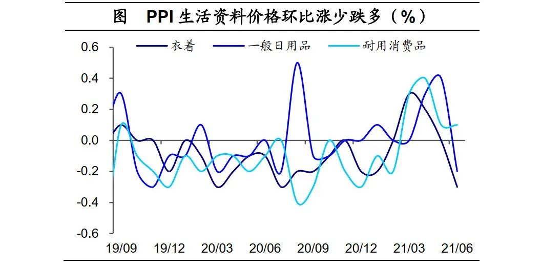 6月PPI生产资料环比继续上涨,只是涨幅有所减弱,但下游的非食品生活资料价格反而下降,其中耐用消费品仍受到上游价格的拉动,而一般日用品和衣着价格均出现明显回落。因而与前期一样,上游涨价虽部分拉动了下游价格,整体传导仍明显不畅。所以往后看,随着工业品价格走过顶点,消费品价格受上游的拉动力量或将持续走弱。