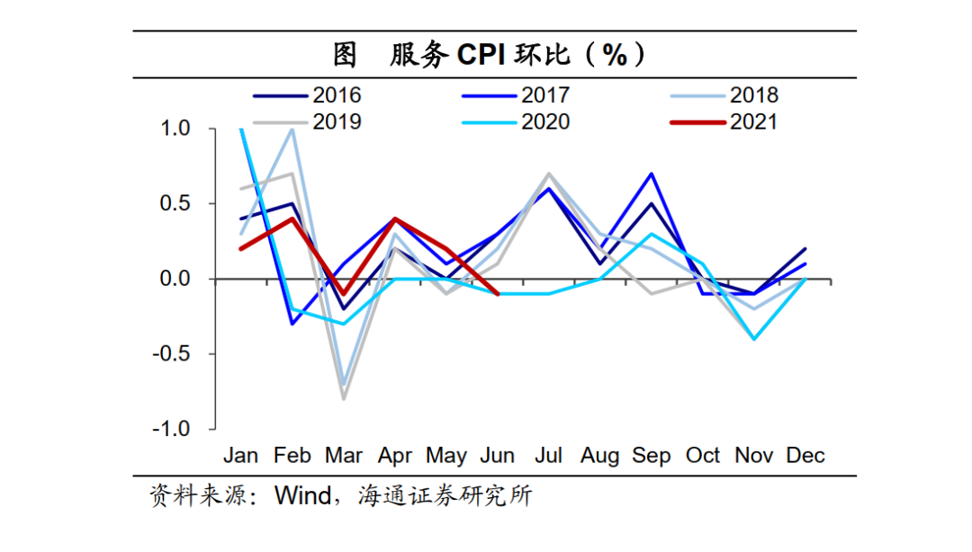 具体来看,前几个月支撑非食品CPI价格的原因主要有两个方面:一是服务业的持续修复。但此驱动因素在6月出现了反复:6月服务CPI环比反季节性走弱(-0.1%),同比增速1%,不及疫情以前2%左右的增长,反映消费、尤其是服务消费复苏的动能依旧乏力。再比如看6月端午节假期的旅游消费,国内旅游出游人次按可比口径恢复至疫前同期的98.7%,而旅游收入仅恢复至74.8%。收入增长缓慢或仍对居民消费能力提升形成制约。