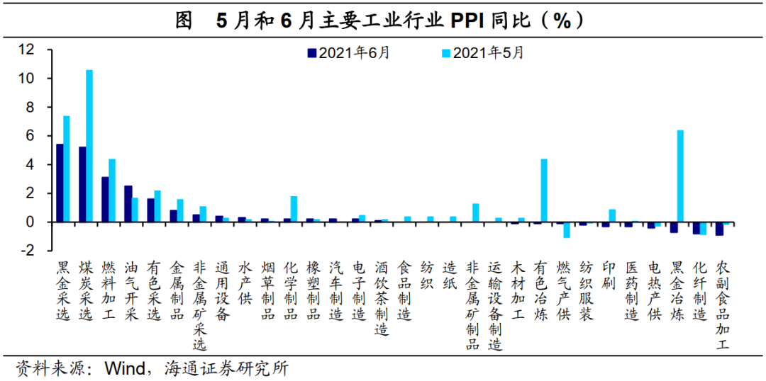 PPI同比涨幅小幅缩窄。6月PPI同比上涨8.8%,仍处在高位,而环比涨幅回落至0.3个百分点,较5月大幅缩窄1.3个百分点。随着“保供稳价”系列政策的落地,国内多数工业品价格出现回落。包括推动煤炭企业增产、投放铜、铝、锌等国家储备等政策,带动黑金冶炼、有色冶炼价格环比回落,煤炭采选虽有上涨,但涨幅也较5月回落。不过国际油价的持续上行,使得油气开采价格涨幅明显扩大。