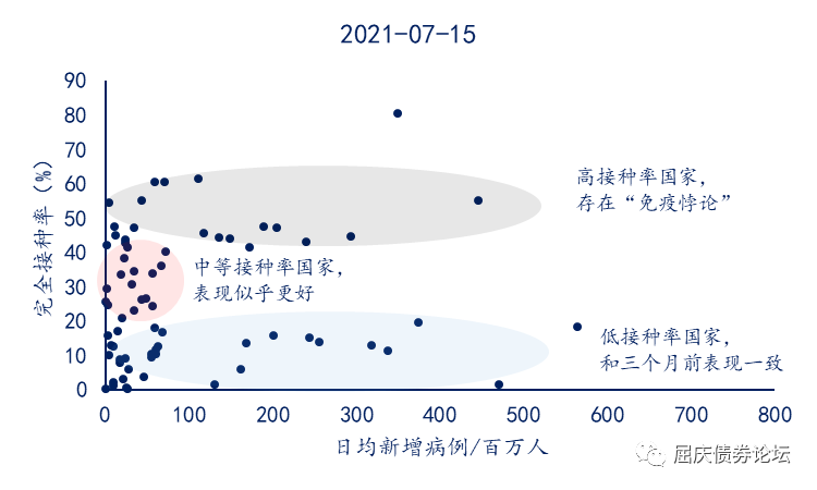 当然,这并不是说疫苗本身对疫情控制没有作用,而是疫情似乎出现了某种“免疫悖论”。为了排除单一国家的影响,我们比较全球范围内各国在7月15日和三个月之前的“完全接种率vs每百万人日均新增病例”关系,以每个圆点代表一个国家,可以发现,随着疫苗的不断接种,全球整体的对应关系从4月份的接近X轴区域,逐步提升至7月的接近Y轴区域,这说明疫苗对于疫情的整体控制仍是有效的;但问题在于,似乎出现了一定的结构性问题:接种率低的国家,表现依旧和3个月前一样较差,接种率高的国家,同样新增病例分化很大,这可能是“接种越高——防疫越差——病例越多”,形成了某种“免疫悖论”,反而是接种率在30%-40%区间的国家,整体防疫效果最好,每百万人新增病例控制在100人以内,这可能和“疫苗尚未普及,防疫不能放松”的心态有关。
