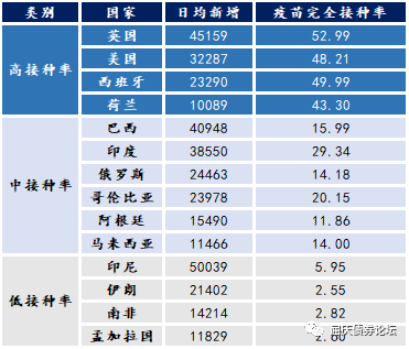 从不同国家来看,截至2021年7月18日,印尼日均新增突破5万例,英国、巴西在4万例以上,印度、美国超3万例,俄罗斯、哥伦比亚、西班牙、伊朗超过2万例,其余国家平均单日小于2万例;从疫苗接种率来看,日均单日新增在1万例以上的国家里,英国、美国、西班牙、荷兰四国完全接种率超过40%,甚至50%;巴西、印度、俄罗斯、哥伦比亚、阿根廷、马来西亚完全接种率在10-30%之间;而印尼、伊朗、南非、孟加拉国在10%以下。可以看出,疫苗背后存在的问题是未来波动的不确定性:发达国家接种率高,但对疫情的蔓延似乎控制力有限,东南亚、南美等人口大国接种率本就不高,后续还有继续扩散的风险。