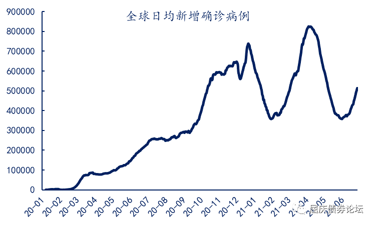 风险资产普跌的背后,反映的是市场对于Delta病毒蔓延的担忧。从新增病例的走势上来看,似乎第三轮疫情高峰即将来临,目前正处于抬头趋势。