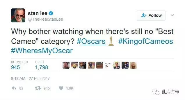 斯坦·李老爷爷调皮的发推称:“奥斯卡有啥好看的,都没有最佳客串这个奖项。”