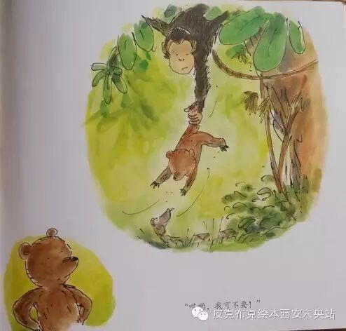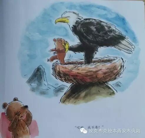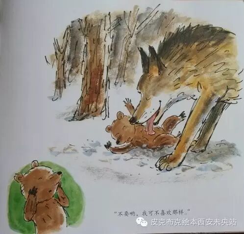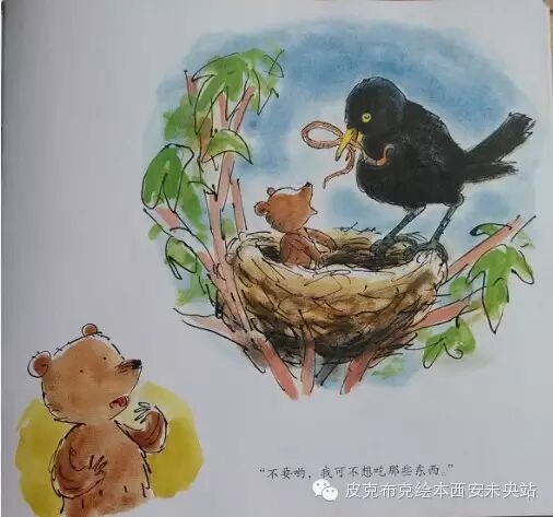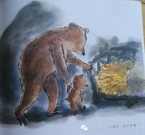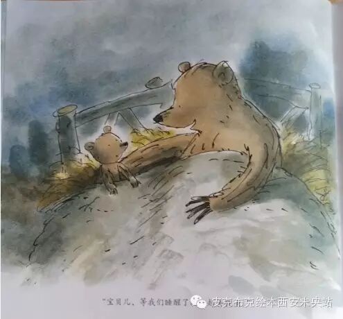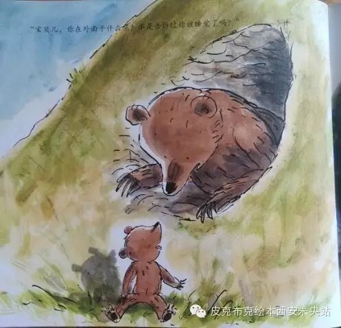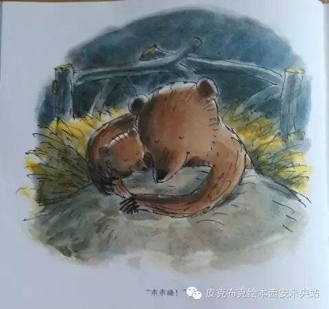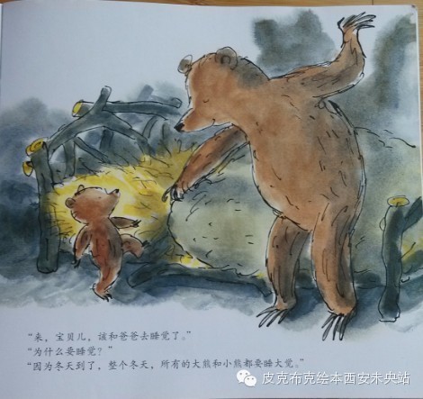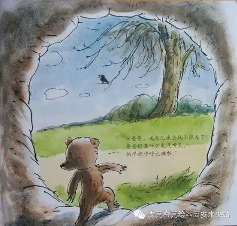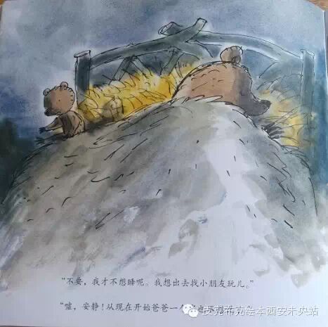 “来,该睡觉了。”熊爸爸说。可小熊一点儿也不困。他想出去找小朋友玩儿。