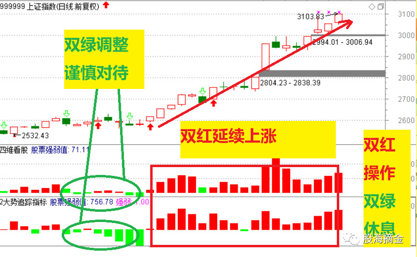 牛市行情能否再看双红指标,只要指标双红延续,说明市场还没有结束。目前已经上涨超过一个月,什么时候出双绿谨慎,双红延续强势,可大胆操作。