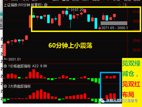 另外,可以看一下,60分钟短线上的买卖点,60分线上,现在是一个顶部震荡走势,但指标是双红,说明是强势震荡。这种震荡出现60分钟双绿时,要及时减仓。