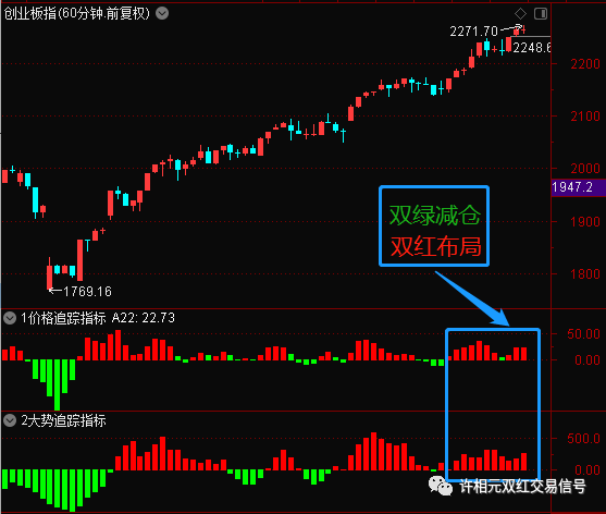 下图为创业板60分钟线,我们可以看到,在创业板走势图上,双绿变双红时,可以大胆操作,双红变双绿时,及时减仓应对,就不用担心市场的趋势问题。