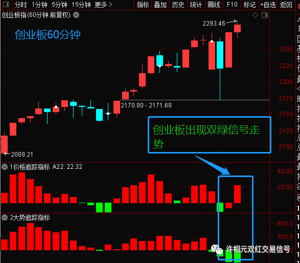 大家可以看一下创业板的双红走势创业板60分钟级别从上午已经出现了一个指标双绿走势一直到现在没有双红。大涨不双红的原因刚才给大家讲了,就是整个市场只涨指数,个股下跌家数较多。所以整体环境已经变差,所以我们操作上,要防范减仓为主。