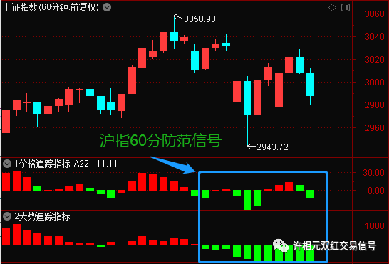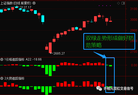 除了市场本身的趋势外,我们从指标上也及时的发现了短期趋势的变化。比如沪指,从日线上,可以看到,昨天我们的双红交易指标出现的是双绿信号,就说明短期趋势已经发生了变化,双绿就要防范为主。