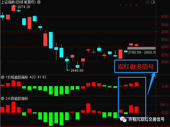 我们从双红指标来看一下当前市场,大家可以看到,三月份大跌后,在底部出现双红做多信号,之后在底部红绿反复,蓄势震荡,上周再次出现双红做多信号,现在已经是延续第四天的双红做多信号,说明市场上涨行情延续,可以大胆操作。