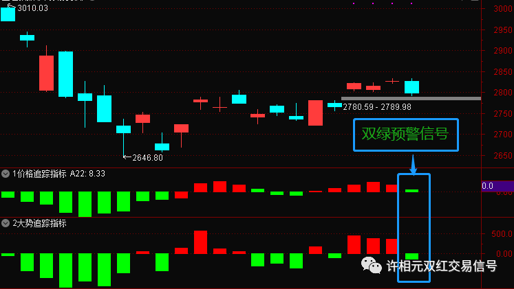 再通过直接指标验证一下,此前市场刚出现反弹时,指标第一时间出现双红启动信号。今天指标出现双绿预警信号,意味着市场暂时变弱,大家还是要谨慎一点,时时关注市场的变化。