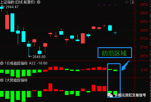 通过指标可以看到,上周五出现双绿走势,市场进入调整,今天双绿延续。在这里,一旦发现60分钟线上出现以红走势,就要及时把仓位调整回来。