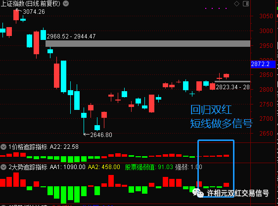 这一点可以通过下面的分析大盘的指标上看出,上周指标出现双红后,在周二三四出现大势指标变绿,而大势指标变绿是人气不足,这是市场形态震荡走势的主因。今天大沪指出现双红确认信心,人气和价格都回归,只等量能也快速跟上就好。