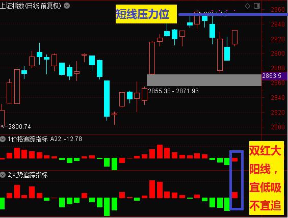 今天双红,但这个双红大阳线把涨幅有所透支,再加上上涨不放量,所以明后天可能面临调整走势。所以在震荡形态中,特别是在上轨处,要重视双绿下跌信号,适当忽略双红上涨信号。