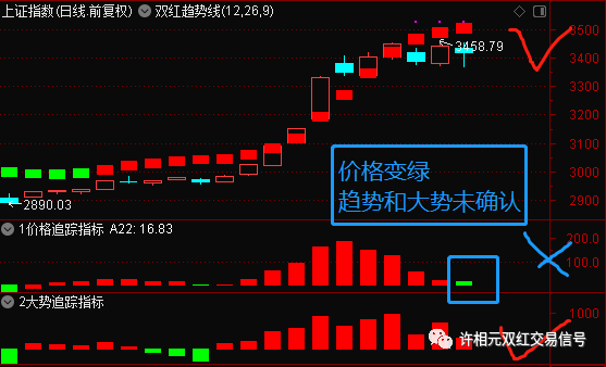 我们看一下目前市场的趋势,从日线上可以看出,今天大势指标变绿,但趋势线和大势指标还处于红色的,所以市场结束趋势还没有确认。