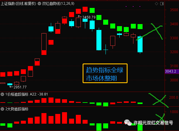 现在市场整体走弱,不管是双红指标还是趋势信号都是绿的,说明市场没什么机会。后期市场只要出现缩量止跌信号,重新操作的机会来临,现在耐心等待。短线操作者做差价也要控制仓位,不要太激进。个股选择上,一方面回避前期涨幅过高的个股,回调可能要深一些,另一方面回避业绩较差个股,后期容易出问题。