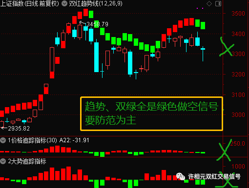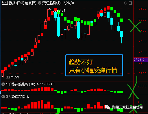 昨天指数尾盘跳水,市场出现走弱迹象。而且昨天我们一直追踪的指标,趋势指标和双红指标都出现绿色的空头信号。这种三线一起出现绿色做空信号,就意味着市场短期走势结束。明天可能市场迎来一个反弹,但是趋势没有变好,整体上还是一个危险区域,所以只能等待市场趋势变好后再能提高仓位操作。