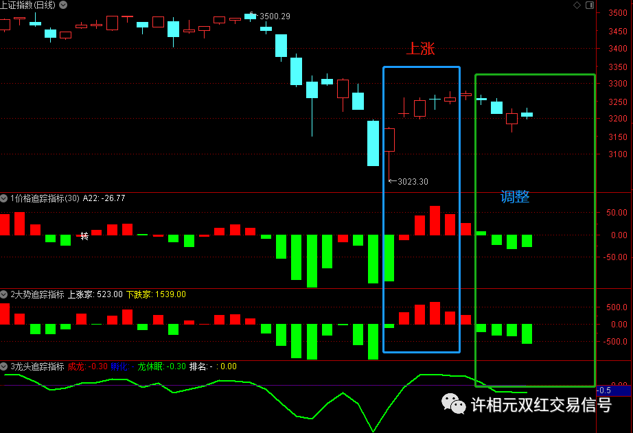 今天市场小幅高开后,延续了双绿调整趋势。当前的市场从指标上可以看到,是一强一弱的两个小波段,如下图,第一波段是3023点后开始反弹,一直到上周四,出现双绿调整,市场反弹阶段结束 ,之后连续四天的调整阶段。所以市场的短线走势,就追踪现在的双红或双绿,在双绿行情要做到,降低仓位,降低买入频率,要小心防范为主。一旦重新出现双红,强势市场回归后,再逐步把仓位提高起来,也可以加大操作频率。