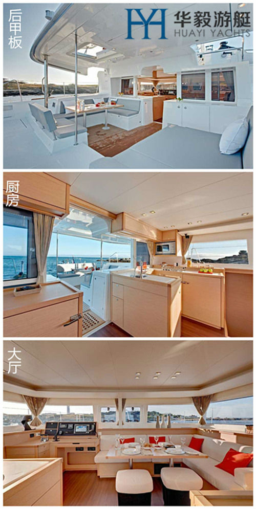 驾驶舱和大厅在同一水平,进而使其有充足的光线和空间感,并且有一个典型的大全景窗户。该前甲板面积也很大,并且帆船双体船体之间有个大的网连接两个船体,可作为一个太阳浴场。无论在什么情况下,它都是一个很好的观测点和孩子的最爱。由于这种宽敞,很少会感到双体船拥挤,即使聚会时,也可以有更多的私密空间远离喧嚣。大多数双体船在船的后面都配备充气艇吊艇架,这种配置非常先进,因为不用拖拉着小船,进而,船的速度不会丢失。