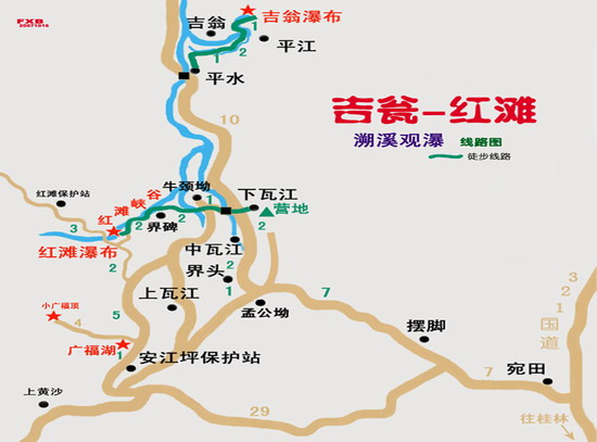 游红滩瀑布)从下瓦江村出发。村前过溪桥沿简易公路右上行——顺车路行1公里至岔路口。右去牛筋坳,左去田湾。中间有一条向下的小道。小道下——至溪。右边十数米溪中有一石垒水坝,从此处过溪。小路上田埂后左上行数米,然后右走田埂,前行至一小水溪。下溪。过溪有向上的小道。小道上。过几株茶树。岔路右走(至小水溪后亦可沿溪上,行百米过竹林,遇小桥,桥前右路直上)。沿人迹重小道前行。走一段像样的石子老路——2公里至一坳口,石碑告诉你这里将进入花坪保护区——放弃左边平行路不走,也不走向下路,中间小路下一点后左行。一下到底——至峡谷溪流。此水自红滩瀑布而来。沿溪水方向上,溪左岸行——遇石崖溪左走不通时,踏着石头过溪走溪右岸。右不行再走左,左右交替前行——1公里后,遇水潭,两岸立壁。右上,攀岩而过。登五米高后下。越过水潭——再行1公里,红滩瀑布出现。行至近前,遇水潭路不通时,攀山左上。攀50米后走上由安江坪方向下来的小道。顺道下至瀑布——原路返下瓦江村。返回桂林。