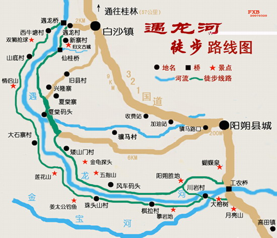 徒步线路1:(遇龙河东岸)遇龙村遇龙桥——新寨村——仙桂桥——旧县村——兴隆寨——夏棠寨——朝阳寨——骥马庄——大榕树(徒步行程16公里)。