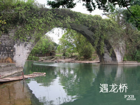 遇龙桥,又名回龙桥。横跨在阳朔县白沙镇遇龙村遇龙河上。遇龙桥建于明永乐十年(1412年),为虹式单拱石桥,条石错缝起拱,干砌。桥长36米,宽4.2米,高9米。造型古朴恢宏,气度非凡,是历史上广西的名桥。