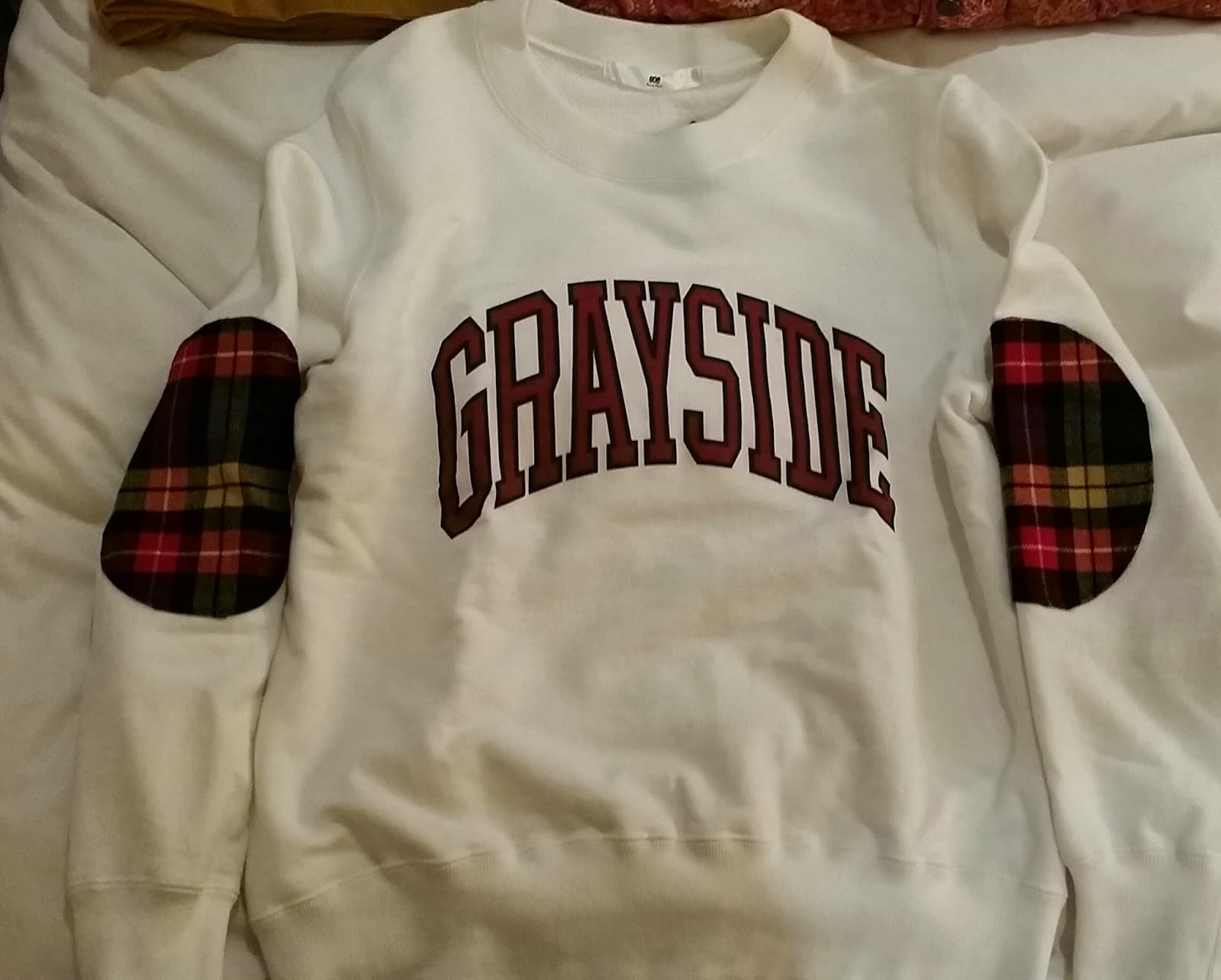 | 白色Sweat shirt本来就不好找,配上黑底红字与两侧手肘的格纹布拼接,点题! |