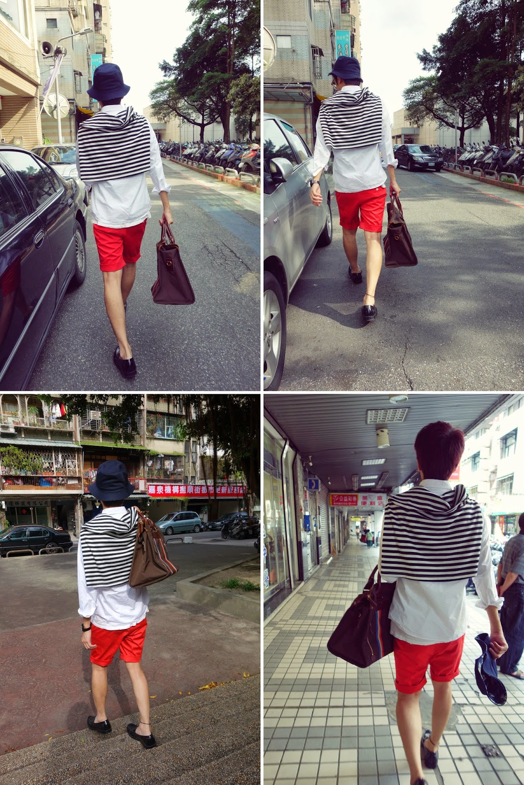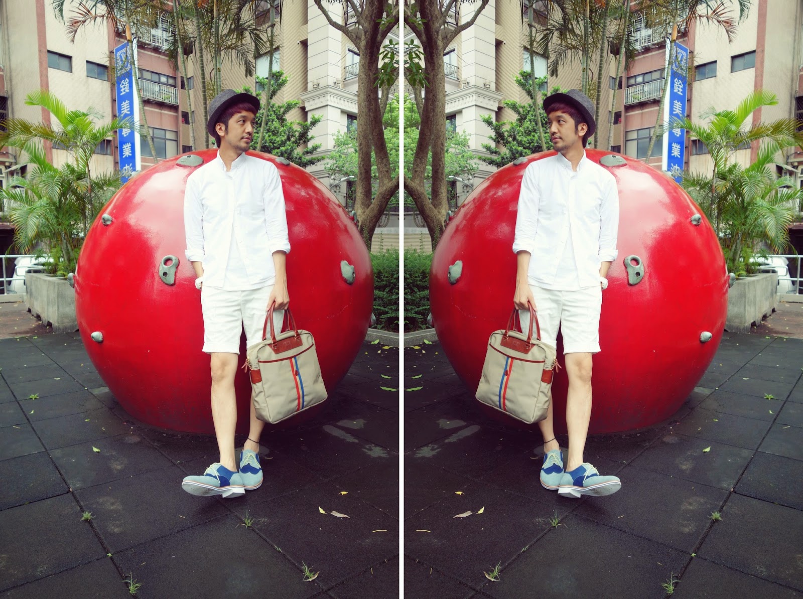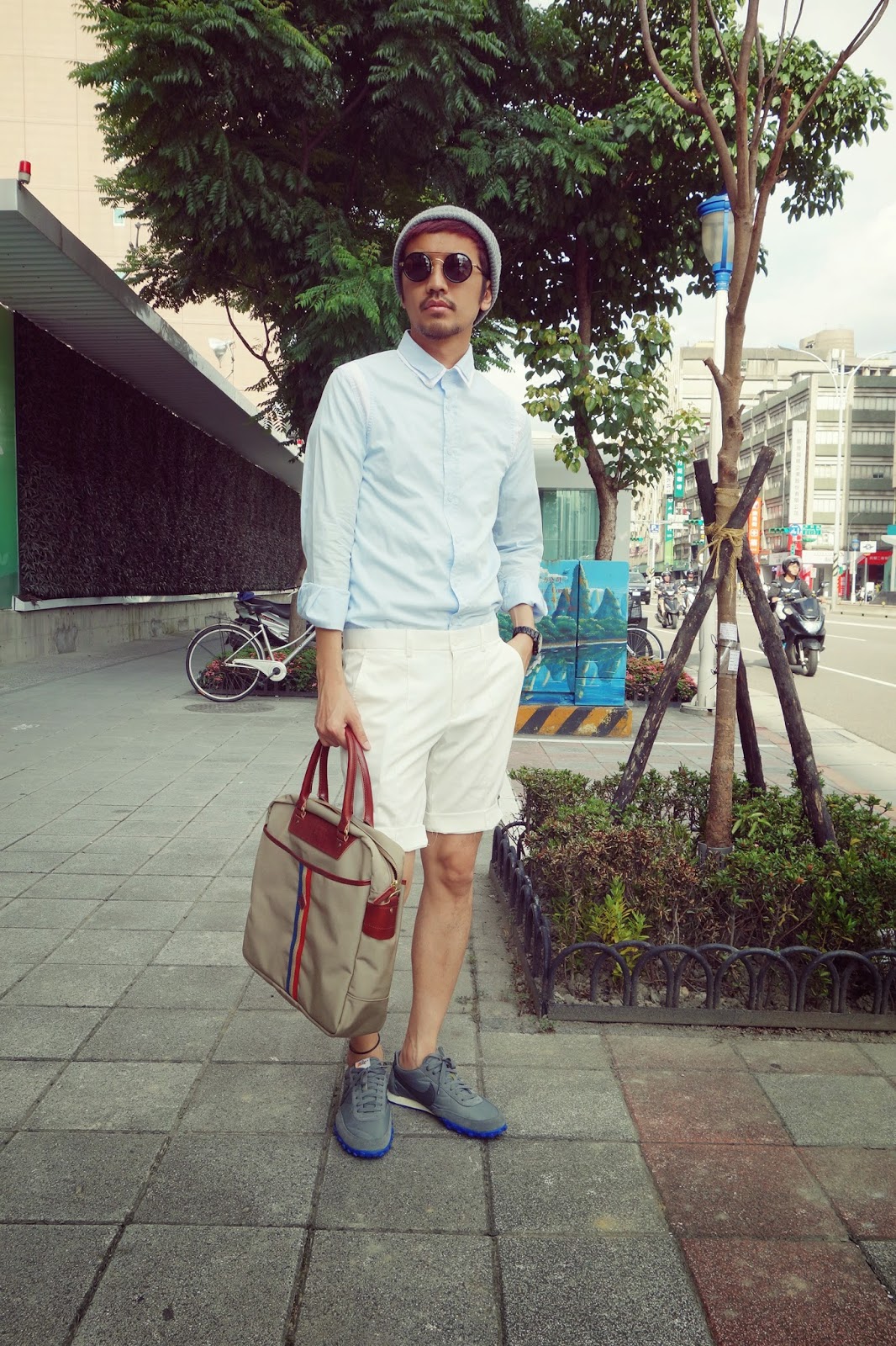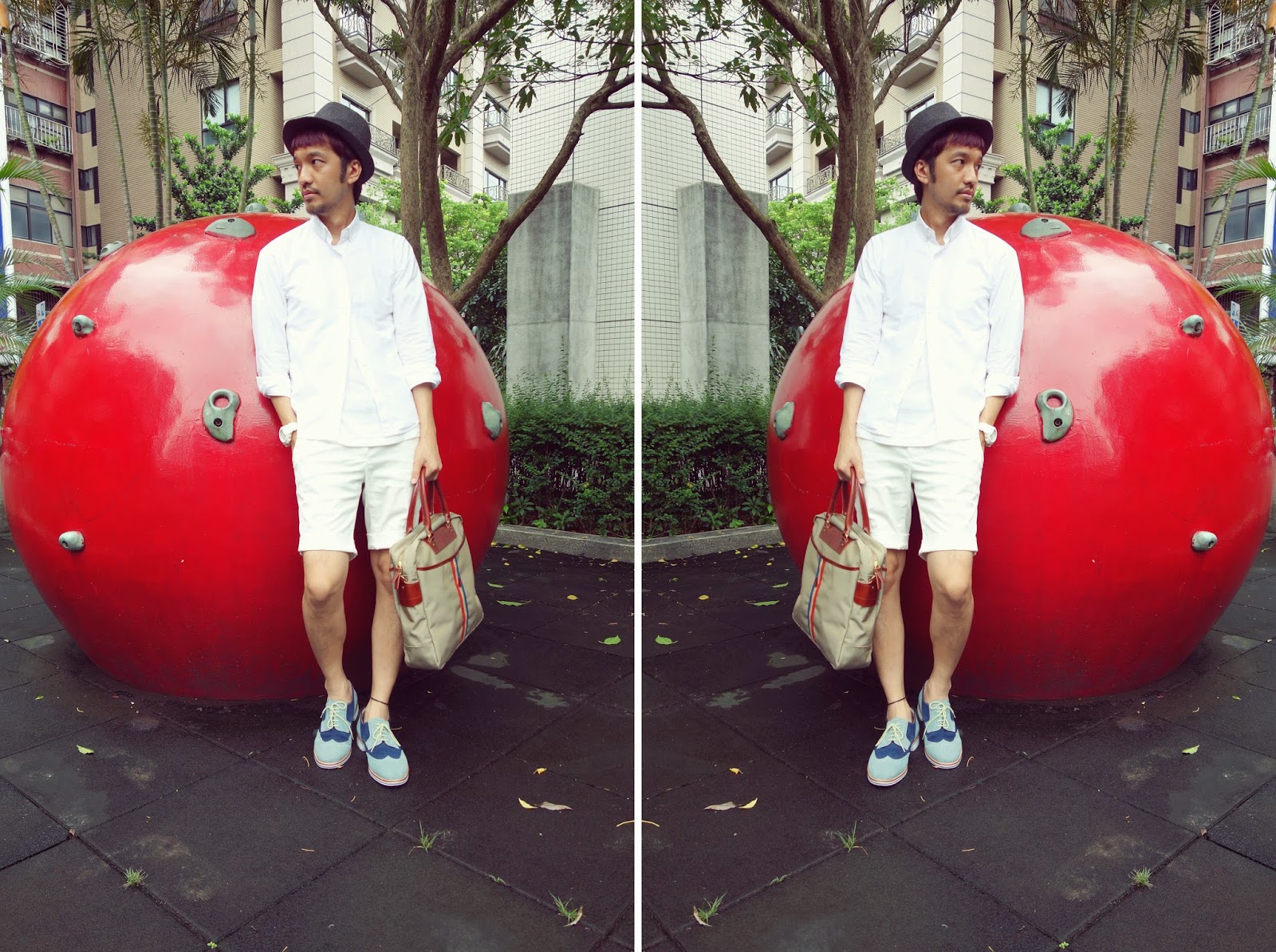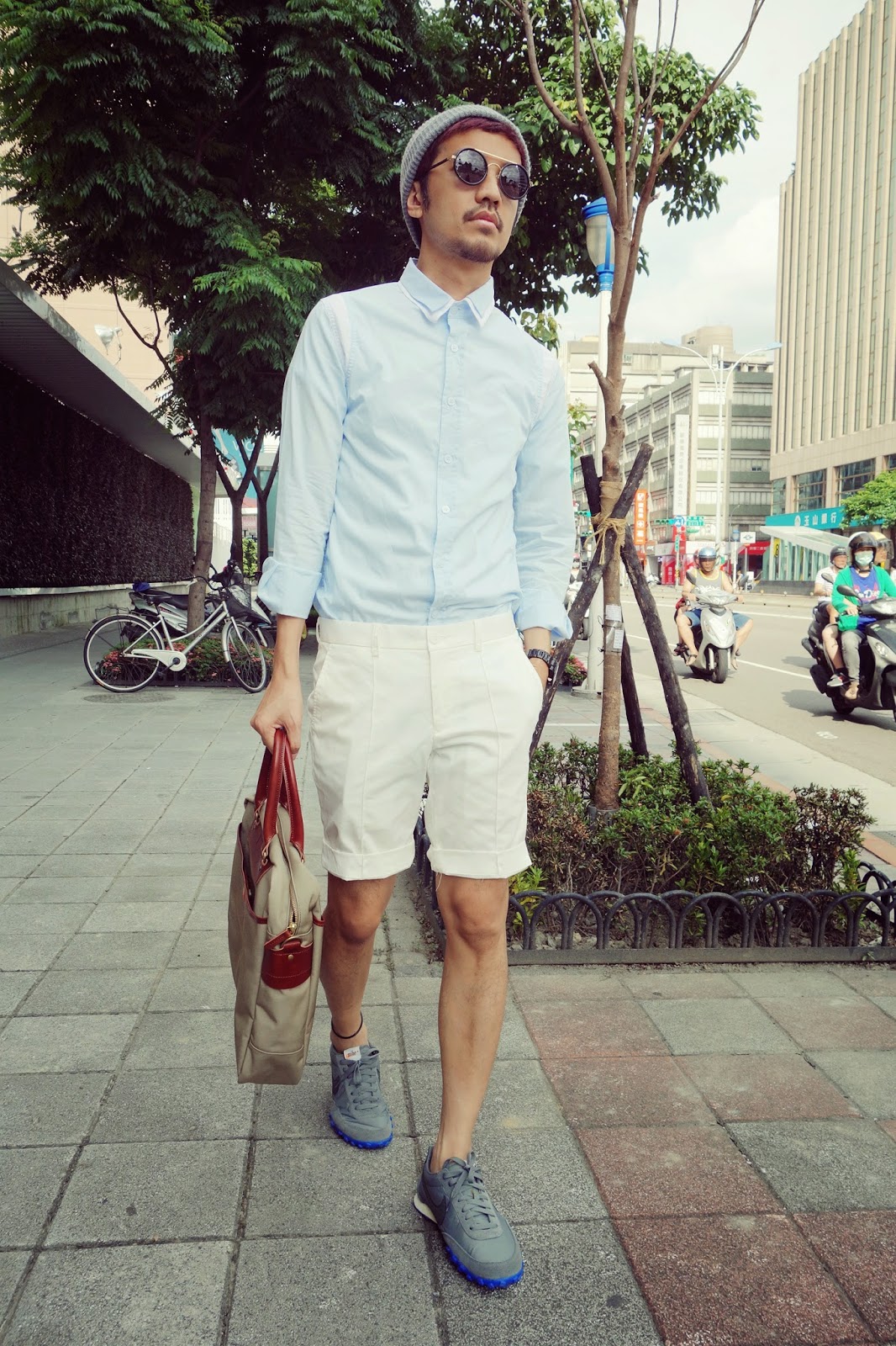 Style 3.白衬衫 x 白色膝上裤 x 绅士帽 x 蓝灰牛津鞋