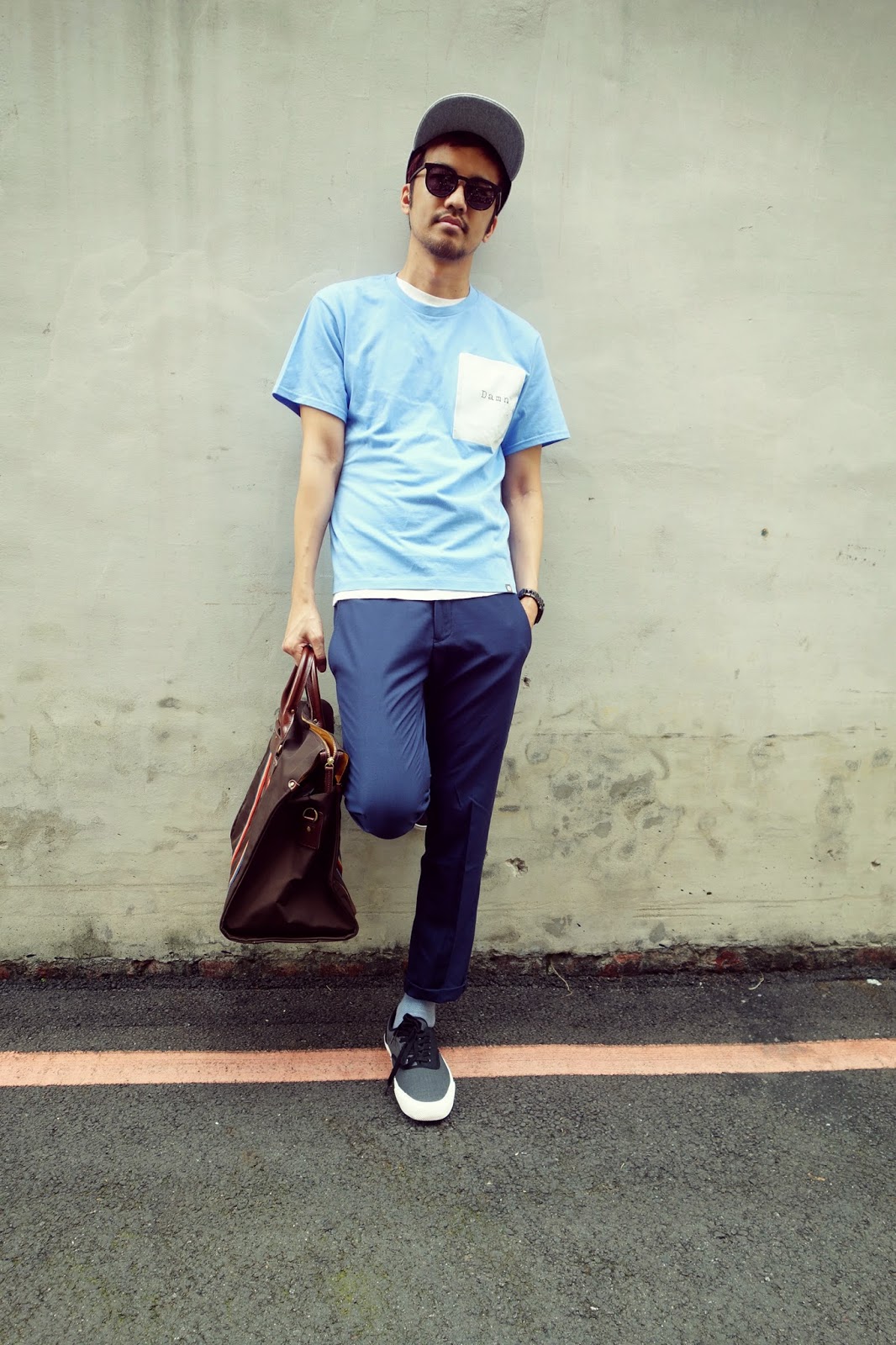 x 深蓝西装裤 x 棒球帽 x 墨镜