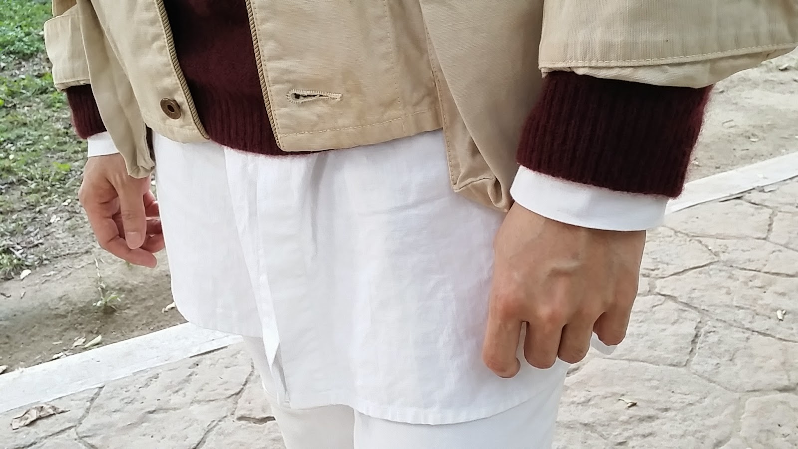 从袖口露出的白、酒红、米三色层次,又是自我感觉良好的美。