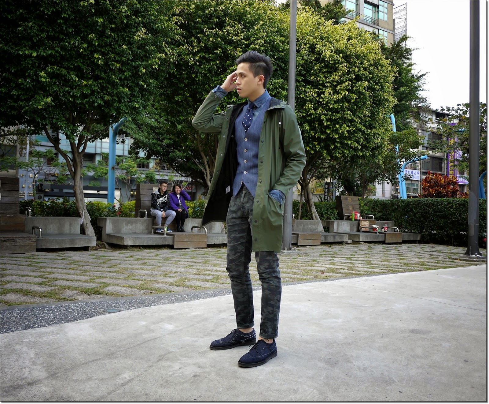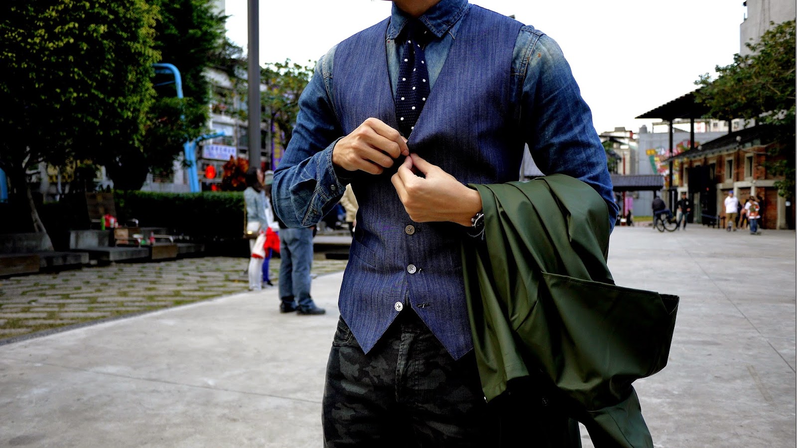 丹宁衬衫、鞋子、背心及迷彩长裤,如果光用想像的会感觉这搭配是个硬汉的选择,但在这里的目的是配合精致的雨衣进行混搭,所以穿得足够合身是第一要点,丹宁面料的皮鞋与西装背心增加正式感同时兼顾粗犷的冲突,最后,再加上人人都有的当红油头完成这个绅士造型。